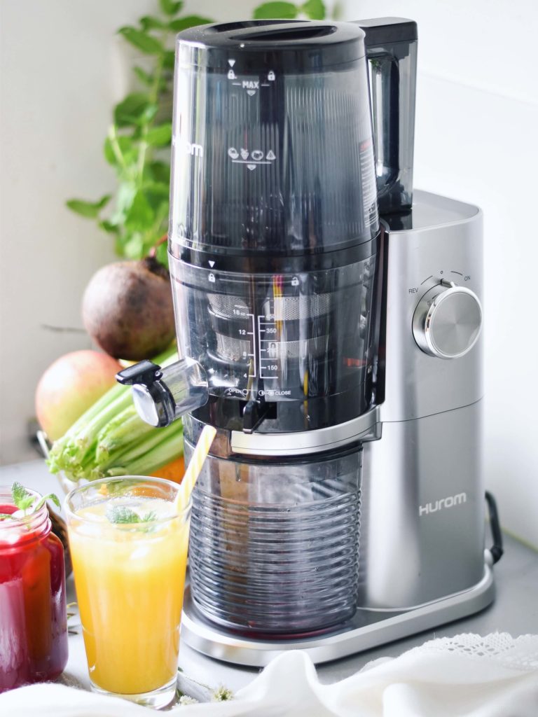 Aby zacząć przygodę z wyciskaniem świeżych soków warto zainwestować w dobry sprzęt, który zostanie z nami na długie lata. Wyciskarka marki Hurom jest wykonana z solidnych materiałów (całą specyfikację techniczną znajdziecie na stronie produktu), a do tego ma piękny design, który z pewnością długo nie wyjdzie z mody. Wyciskarka zajmuje mało miejsca na blacie, dzięki czemu może stanowić nowoczesną (i praktyczną oczywiście :D) ozdobę kuchni. Nawet pojemnik na pulpę wygląda ciekawie i nie zajmuje dodatkowego miejsca, dzięki strategicznemu umiejscowieniu go. 🙂