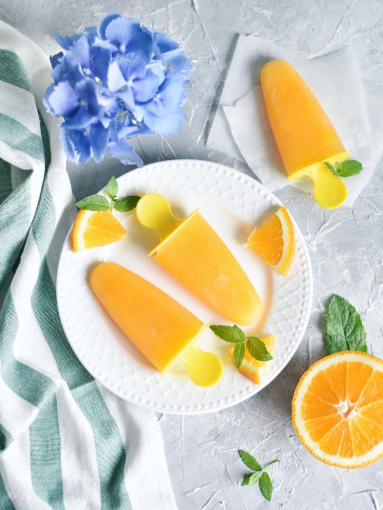 Świetnym pomysłem na orzeźwienie w upalne dni są także lody, które otrzymamy ze świeżo wyciśniętego soku! <3 Wystarczy wycisnąć sok np. z 2 pomarańczy i kawałka melona z dodatkiem kilku listków świeżej mięty, przelać do foremek na lody (swoje kupiłam w Ikei), zamrozić przez noc i cieszyć się pysznym sorbetem na patyku.