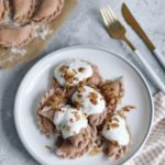 8. Gotowe pierogi podajemy z podsmażoną wcześniej cebulką i jogurtem naturalnym.