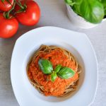 To spaghetti to dla mnie kwintesencja smaku lata – w tym czasie zdecydowanie warto sięgnąć po świeże pomidory, najlepiej malinowe lub polne, które są według mnie najsłodsze i najbardziej aromatyczne. 🙂 Zimą oczywiście sprawdzą się również pomidory w puszce, ale tego makaronu trzeba zdecydowanie spróbować choć raz ze świeżymi! 🙂